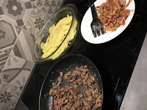 Hade lite älgskav som jag stekte upp med salt och peppar, bacon och en lök. Varvade i en form med tunt skivad potatis, slat och peppar och några ostskivor högst upp. 200 grader i nu 25 minuter men tycker inte den ser klar ut nu så jag låter den nog ligga inne ytterligare 10 minuter så den börjar puttra och pysa lite smaskigt.